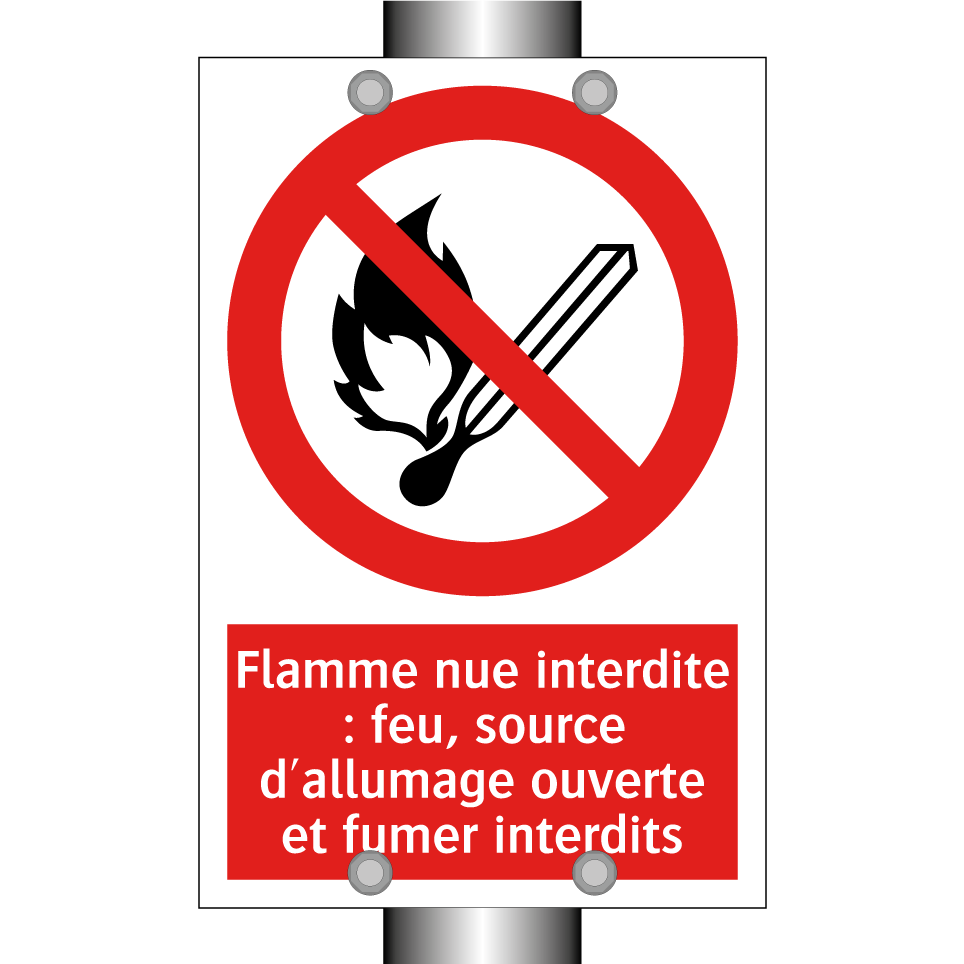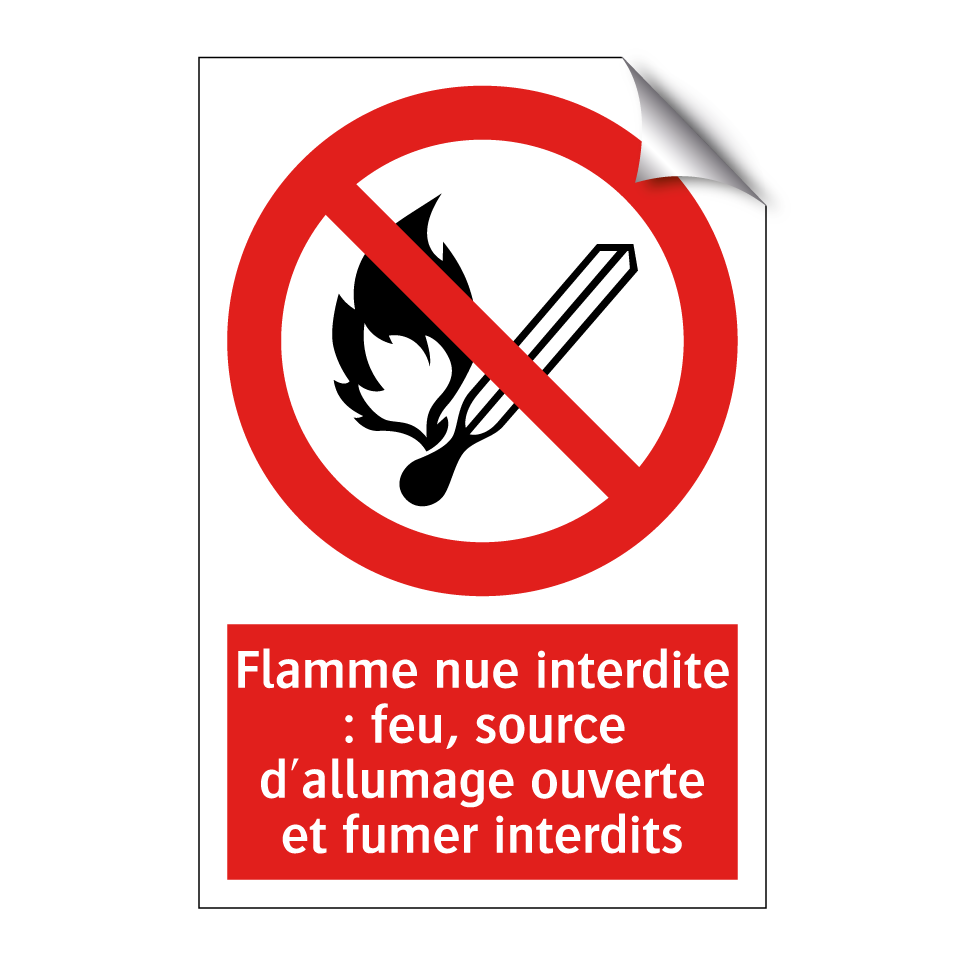 Panneau d'interdiction avec le texte : "Flamme nue interdite : feu, source d'allumage ouverte et fumer interdits" et une symbolique claire.