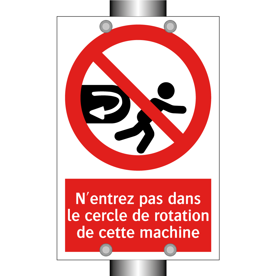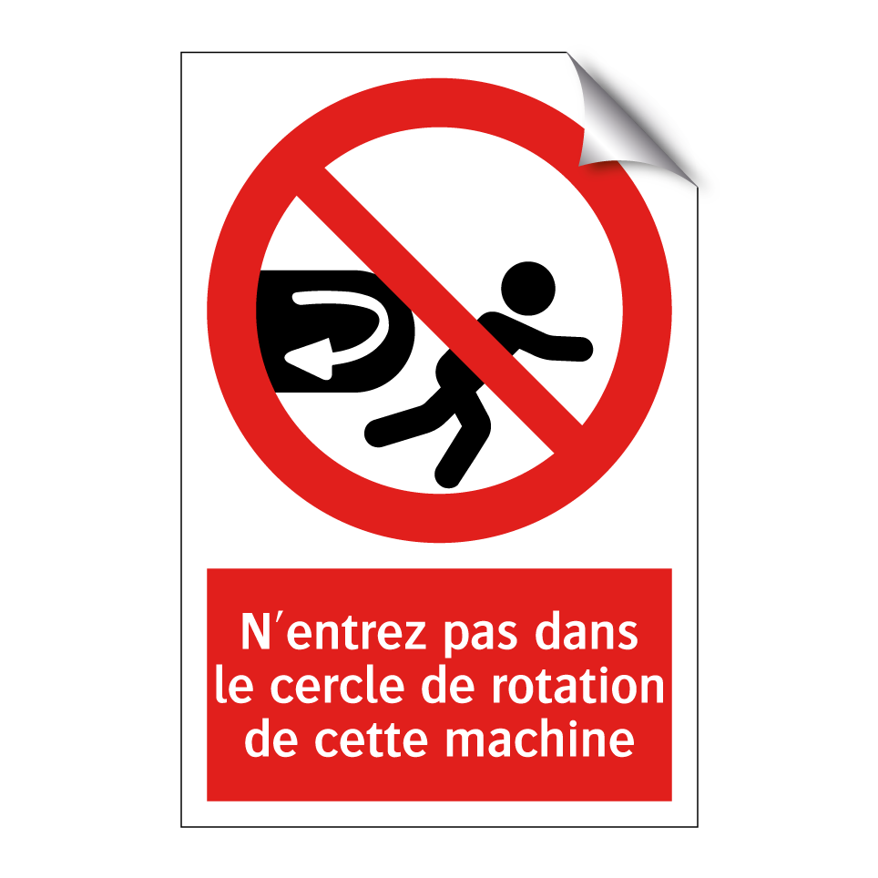 Panneau d'interdiction avec le texte : "N'entrez pas dans le cercle de rotation de cette machine" et une symbolique claire.