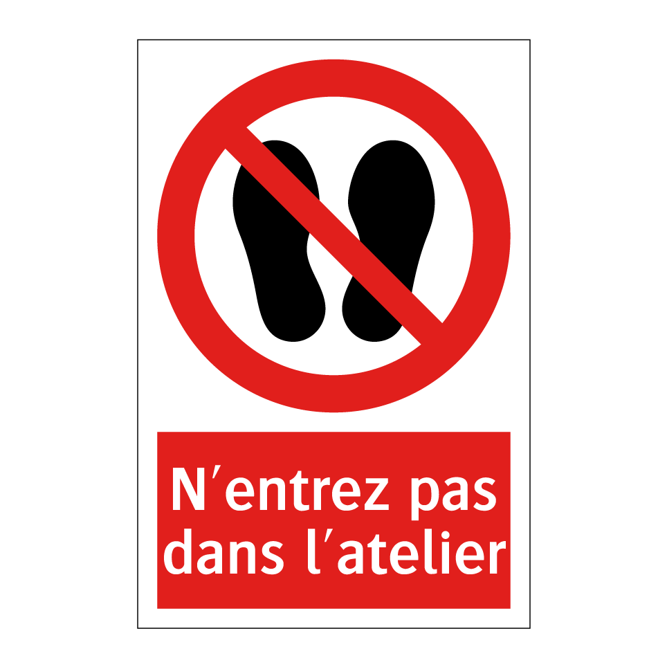 Panneau d'interdiction avec le texte : "N'entrez pas dans l'atelier" et une symbolique claire.