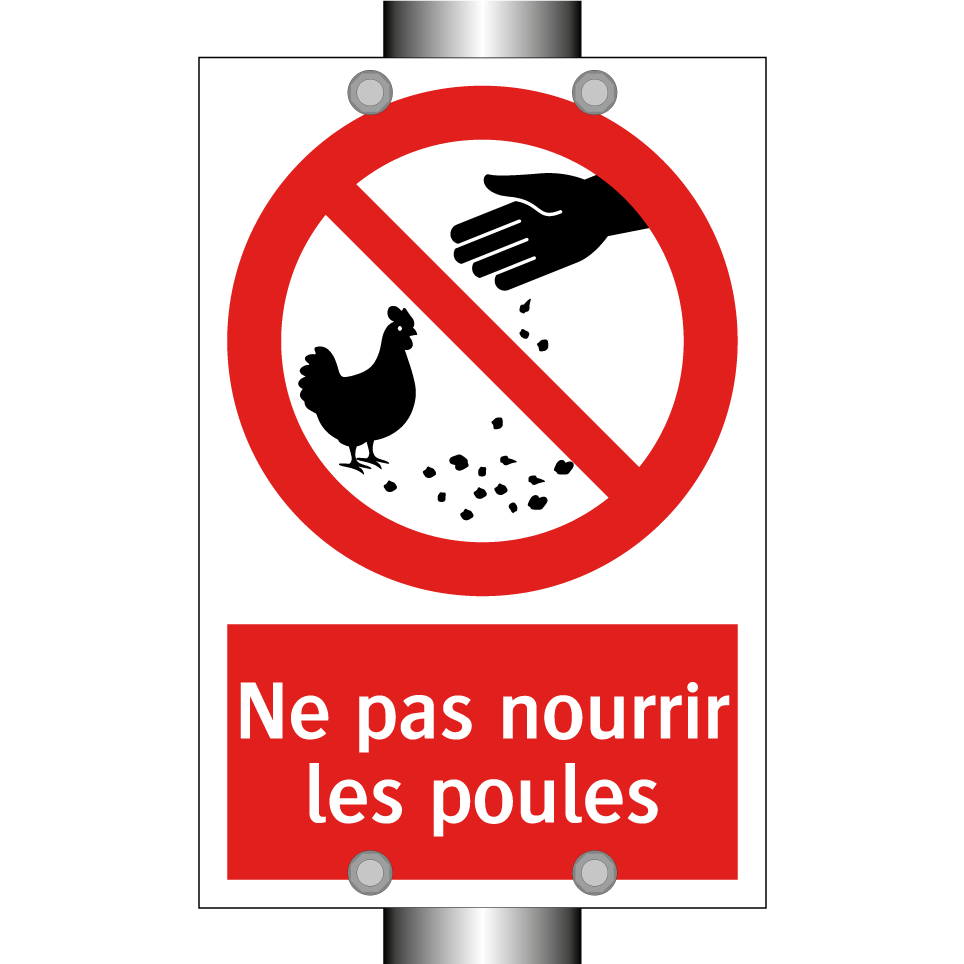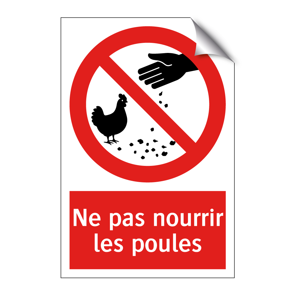 Panneau d'interdiction avec le texte : "Ne pas nourrir les poules" et une symbolique claire.