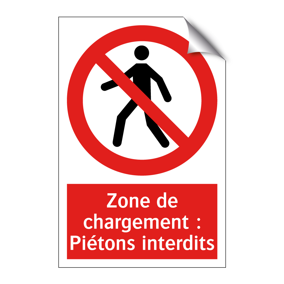 Panneau d'interdiction avec le texte : "Zone de chargement : Piétons interdits" et une symbolique claire.