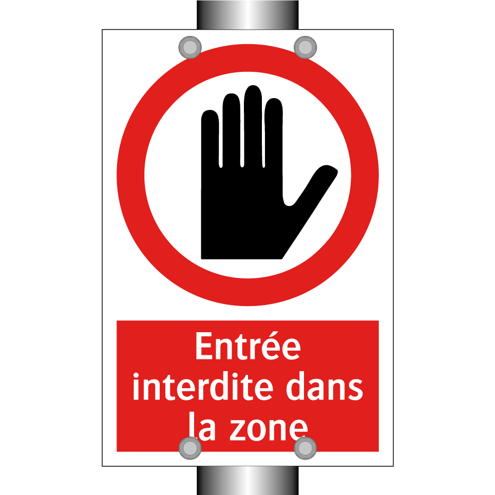 Panneau d'interdiction avec le texte : "Entrée interdite dans la zone" et une symbolique claire.