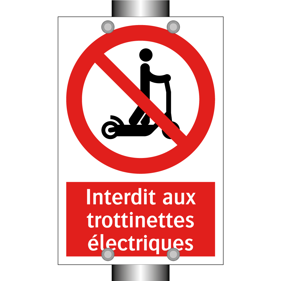 Panneau d'interdiction avec le texte : "Interdit aux trottinettes électriques" et une symbolique claire.