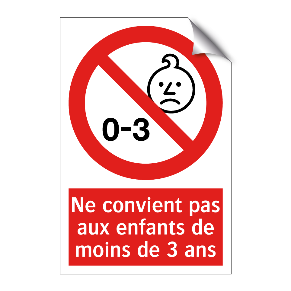 Panneau d'interdiction avec le texte : "Ne convient pas aux enfants de moins de 3 ans" et une symbolique claire.