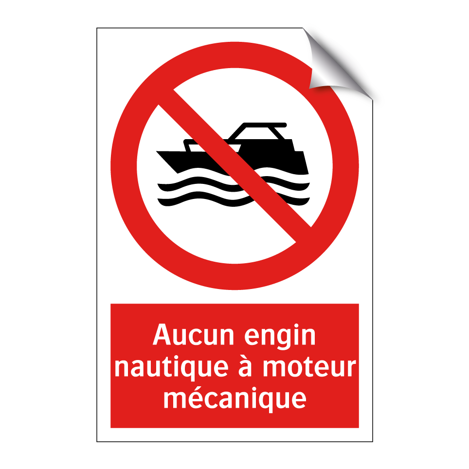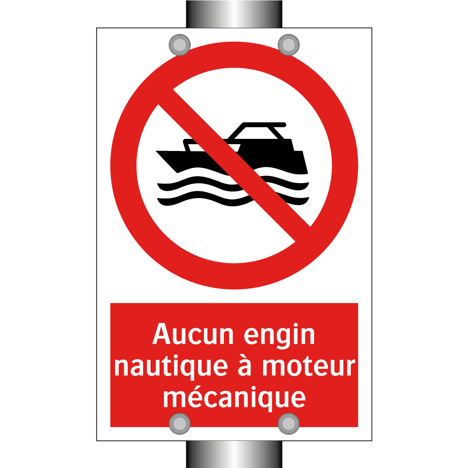 Panneau d'interdiction avec le texte : "Aucun engin nautique à moteur mécanique" et une symbolique claire.