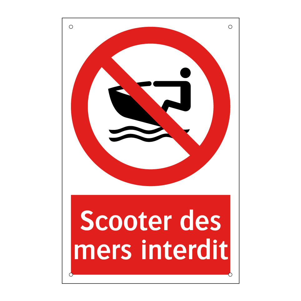 Panneau d'interdiction avec le texte : "Scooter des mers interdit" et une symbolique claire.