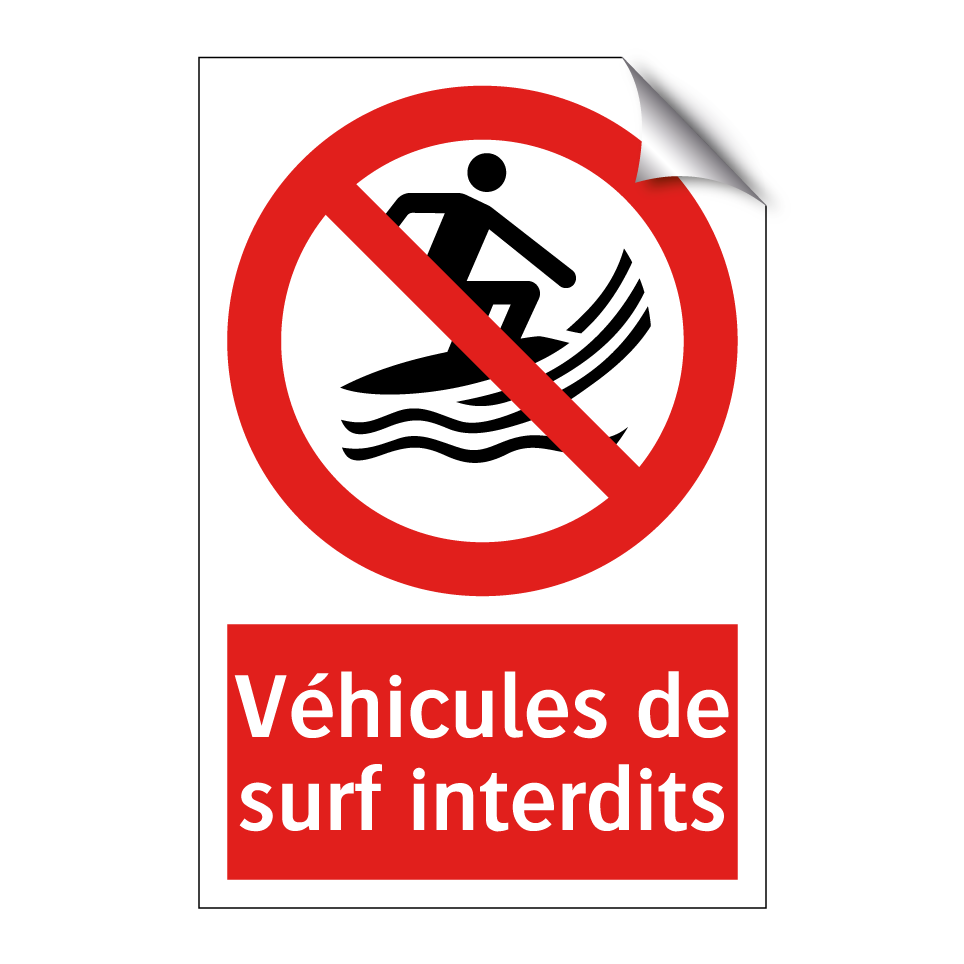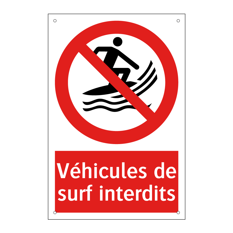 Panneau d'interdiction avec le texte : "Véhicules de surf interdits" et une symbolique claire.
