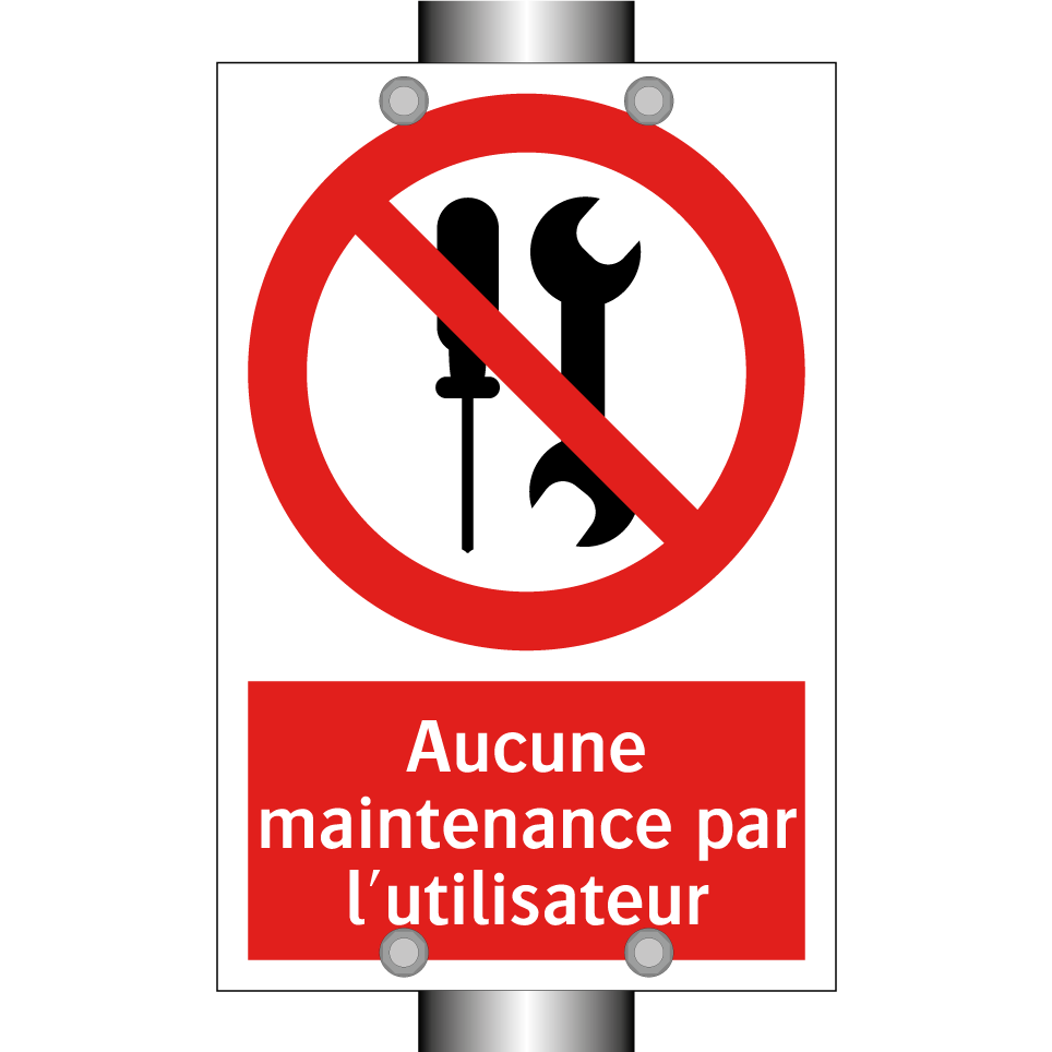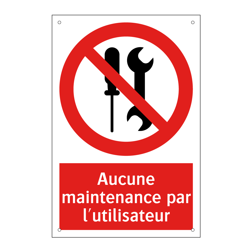 Panneau d'interdiction avec le texte : "Aucune maintenance par l'utilisateur" et une symbolique claire.