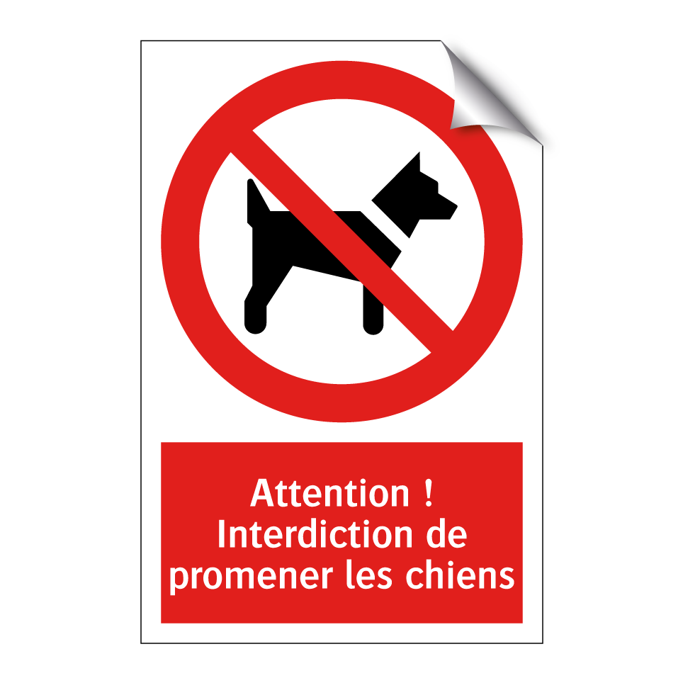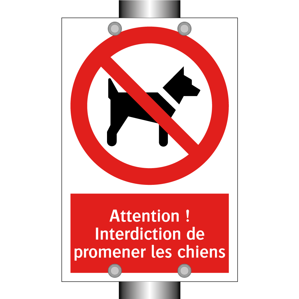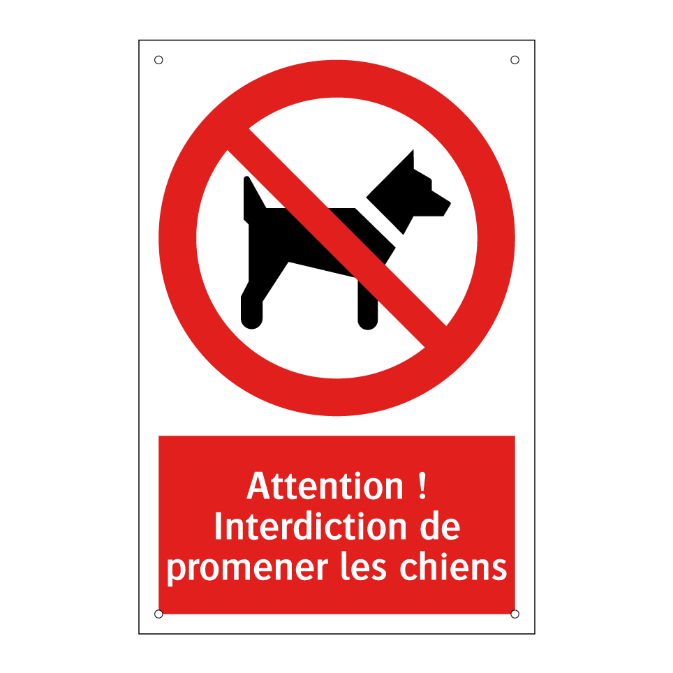 Panneau d'interdiction avec le texte : "Attention ! Interdiction de promener les chiens" et une symbolique claire.