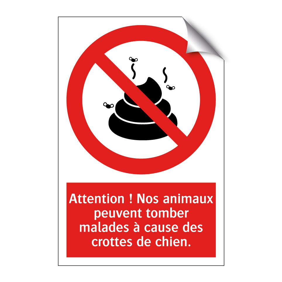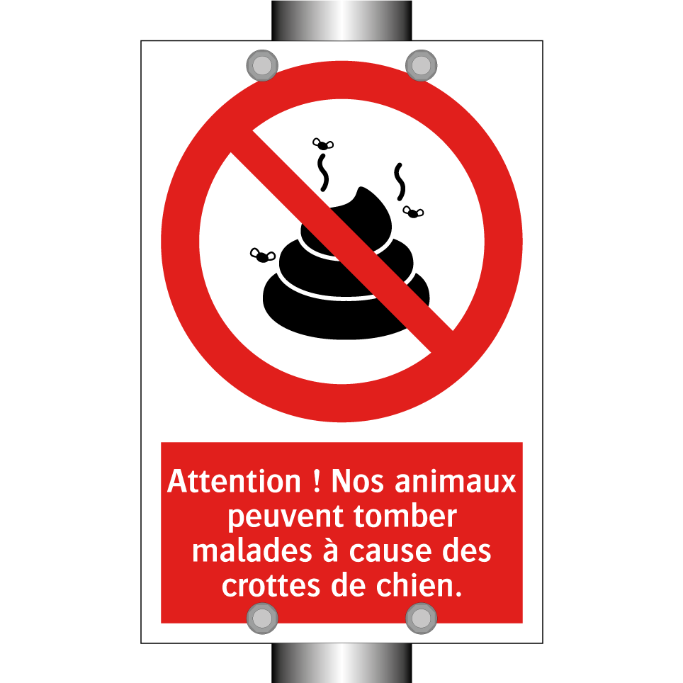 Panneau d'interdiction avec le texte : "Attention ! Nos animaux peuvent tomber malades à cause des crottes de chien." et une symbolique claire.