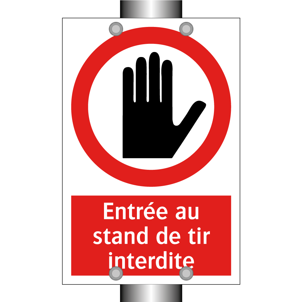 Panneau d'interdiction avec le texte : "Entrée au stand de tir interdite" et une symbolique claire.