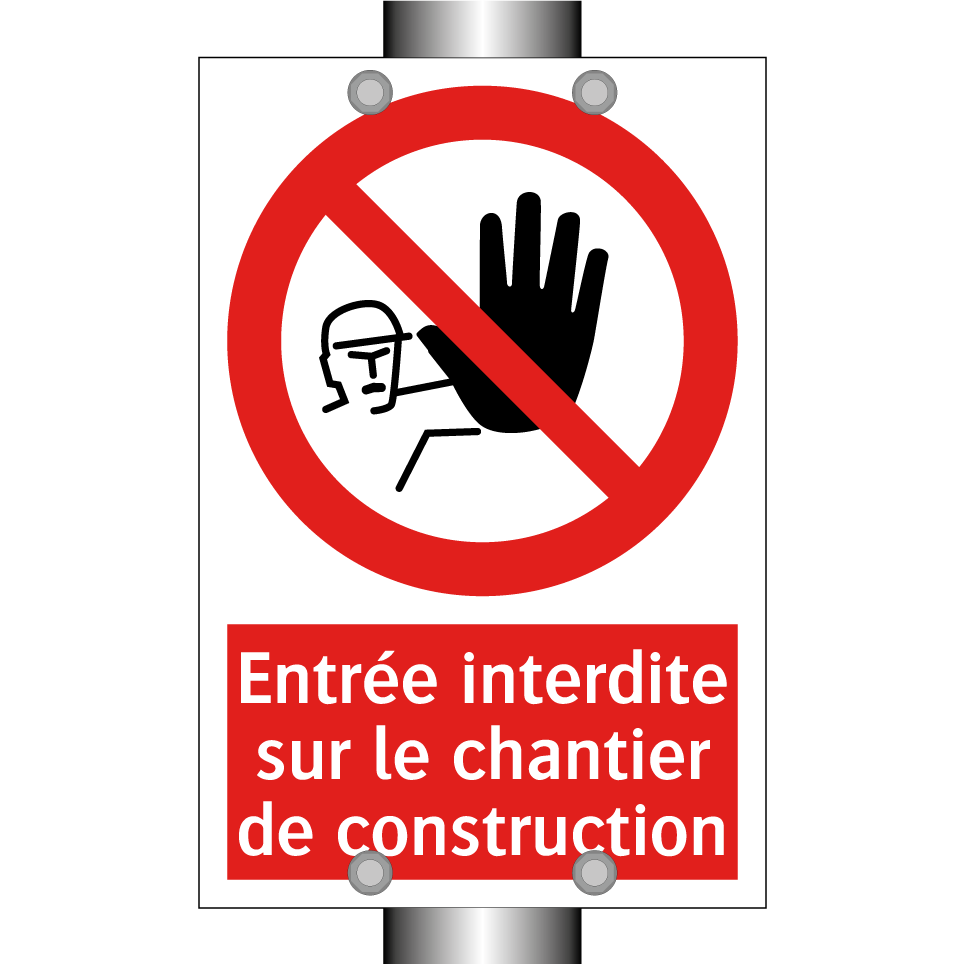 Panneau d'interdiction avec le texte : "Entrée interdite sur le chantier de construction" et une symbolique claire.