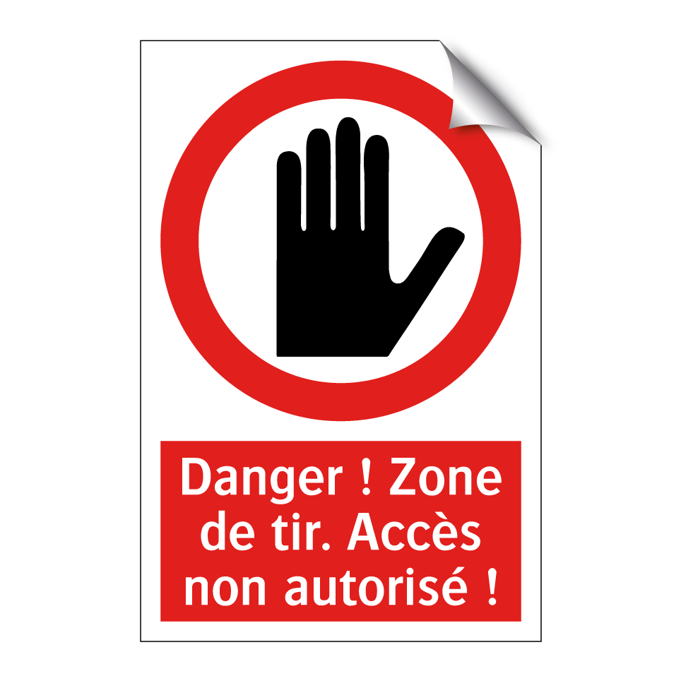 Panneau d'interdiction avec le texte : "Danger ! Zone de tir. Accès non autorisé !" et une symbolique claire.