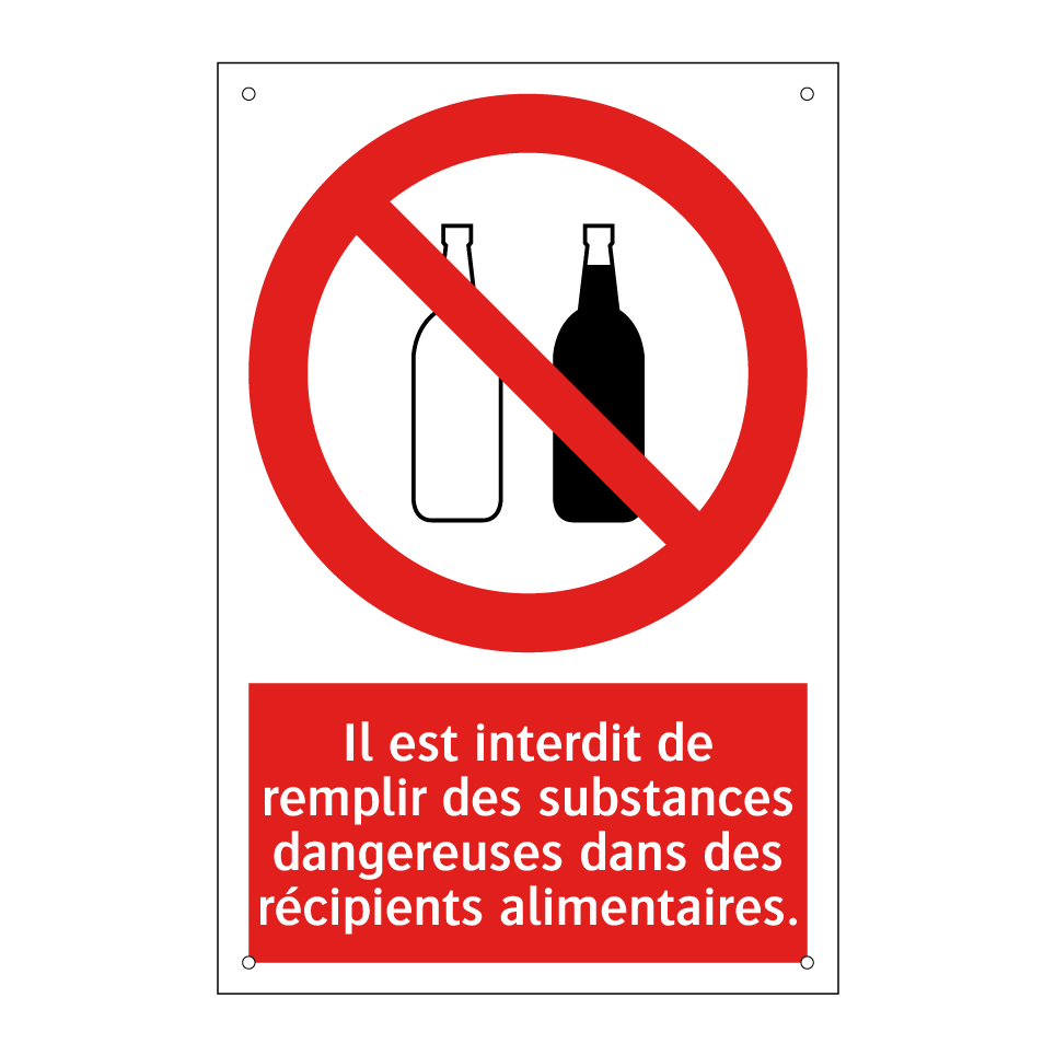 Panneau d'interdiction avec le texte : "Il est interdit de remplir des substances dangereuses dans des récipients alimentaires." et une symbolique claire.