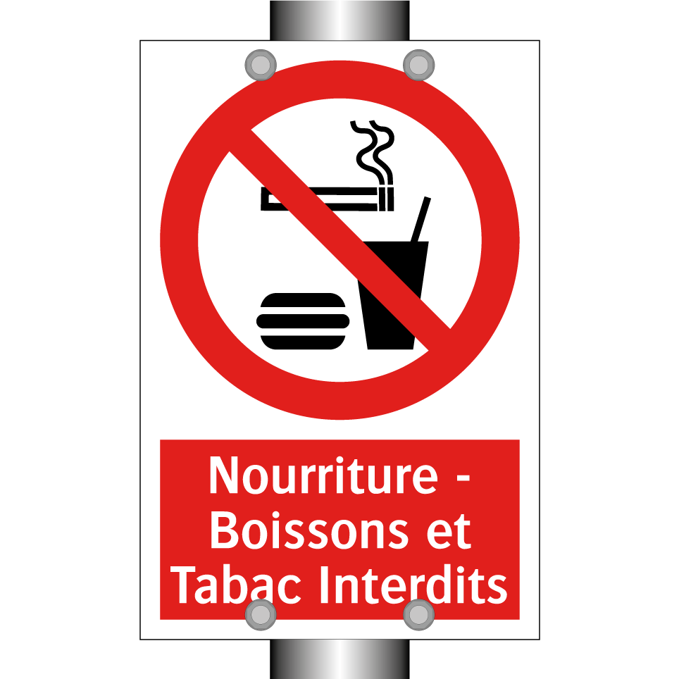 Panneau d'interdiction avec le texte : "Nourriture - Boissons et Tabac Interdits" et une symbolique claire.