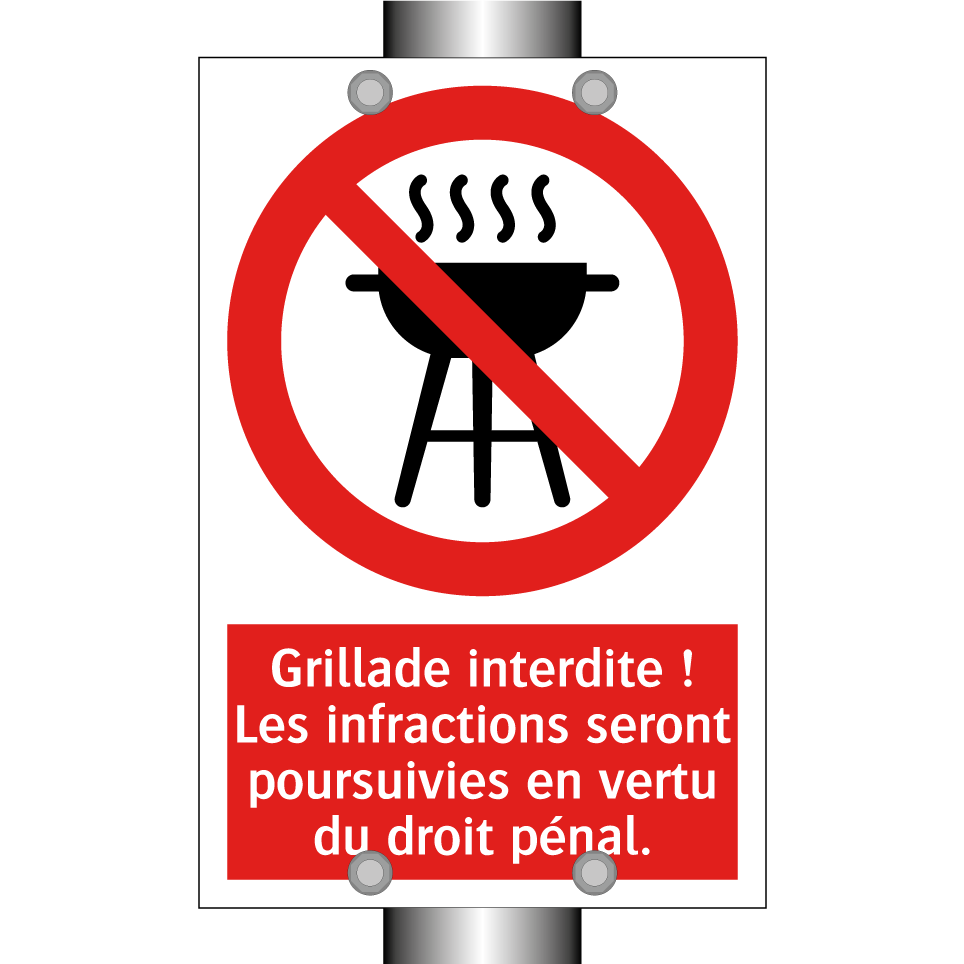 Panneau d'interdiction avec le texte : "Grillade interdite ! Les infractions seront poursuivies en vertu du droit pénal." et une symbolique claire.