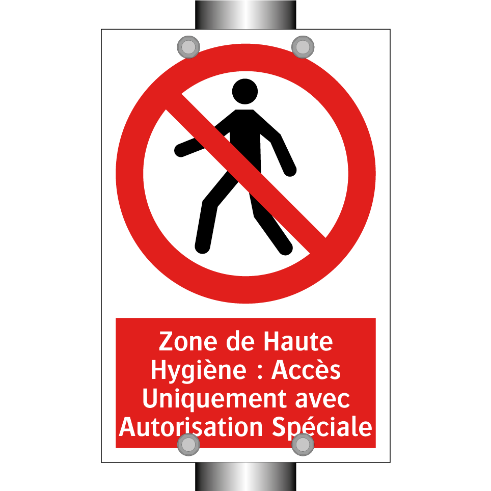 Panneau d'interdiction avec le texte : "Zone de Haute Hygiène : Accès Uniquement avec Autorisation Spéciale" et une symbolique claire.