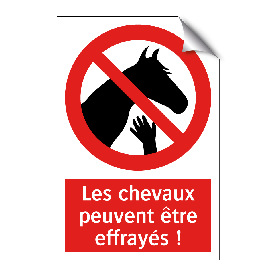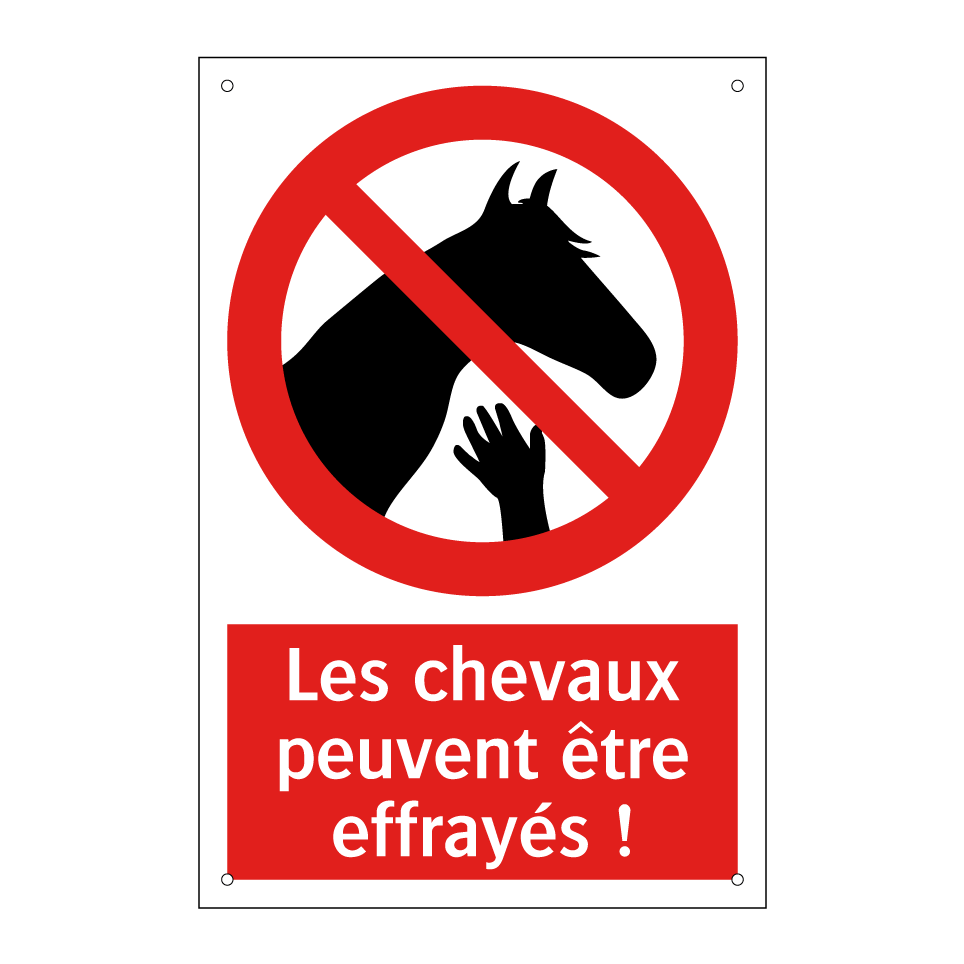 Panneau d'interdiction avec le texte : "Les chevaux peuvent être effrayés !" et une symbolique claire.