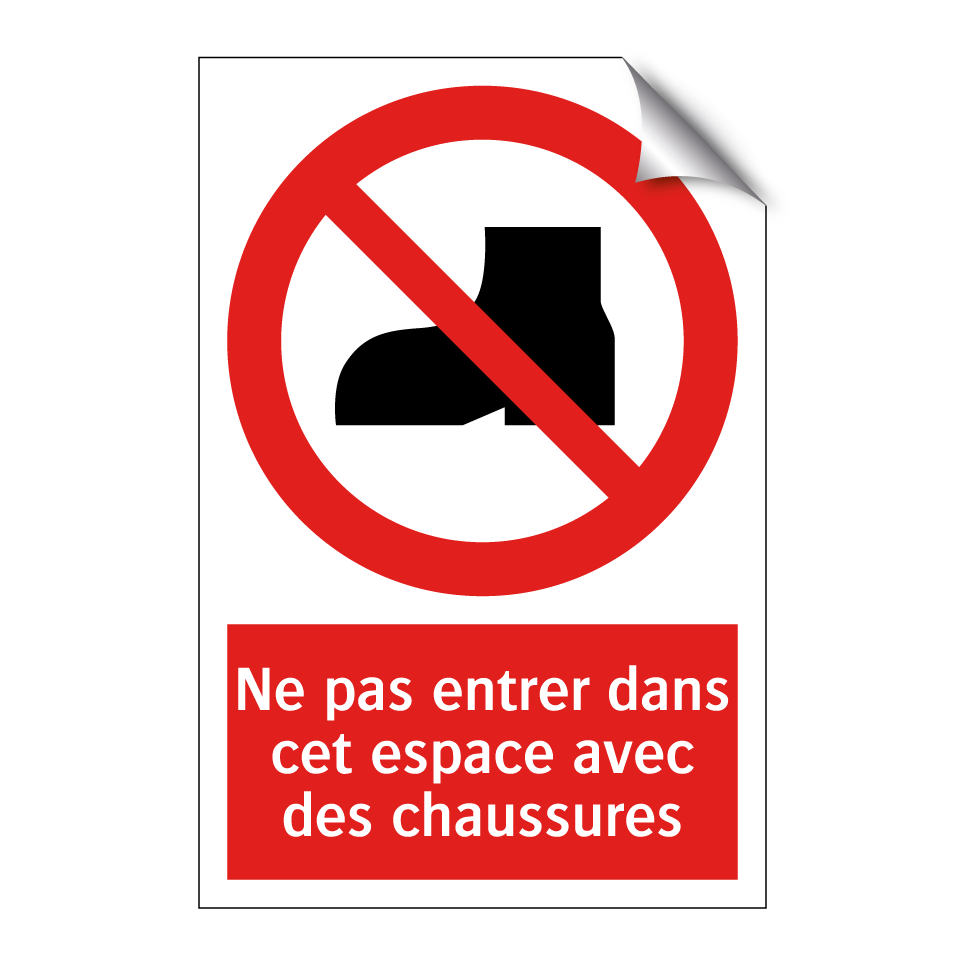 Panneau d'interdiction avec le texte : "Ne pas entrer dans cet espace avec des chaussures" et une symbolique claire.