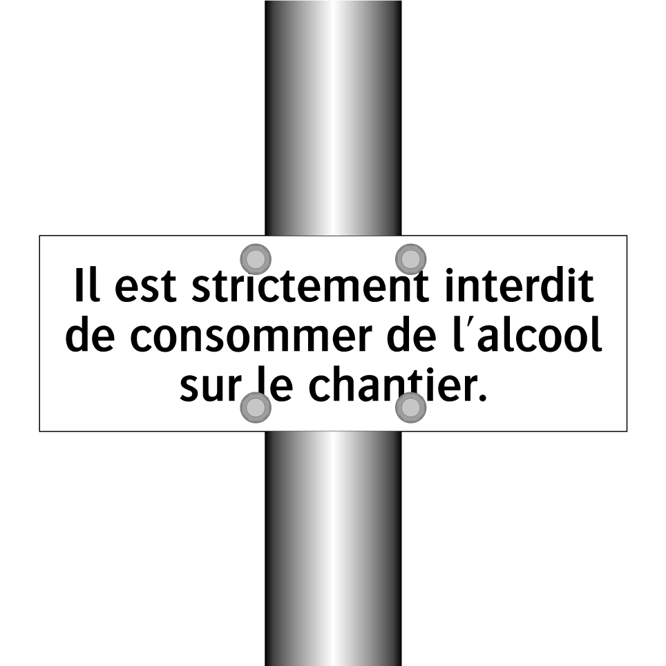 Panneau d'interdiction avec le texte : "Il est strictement interdit de consommer de l'alcool sur le chantier."