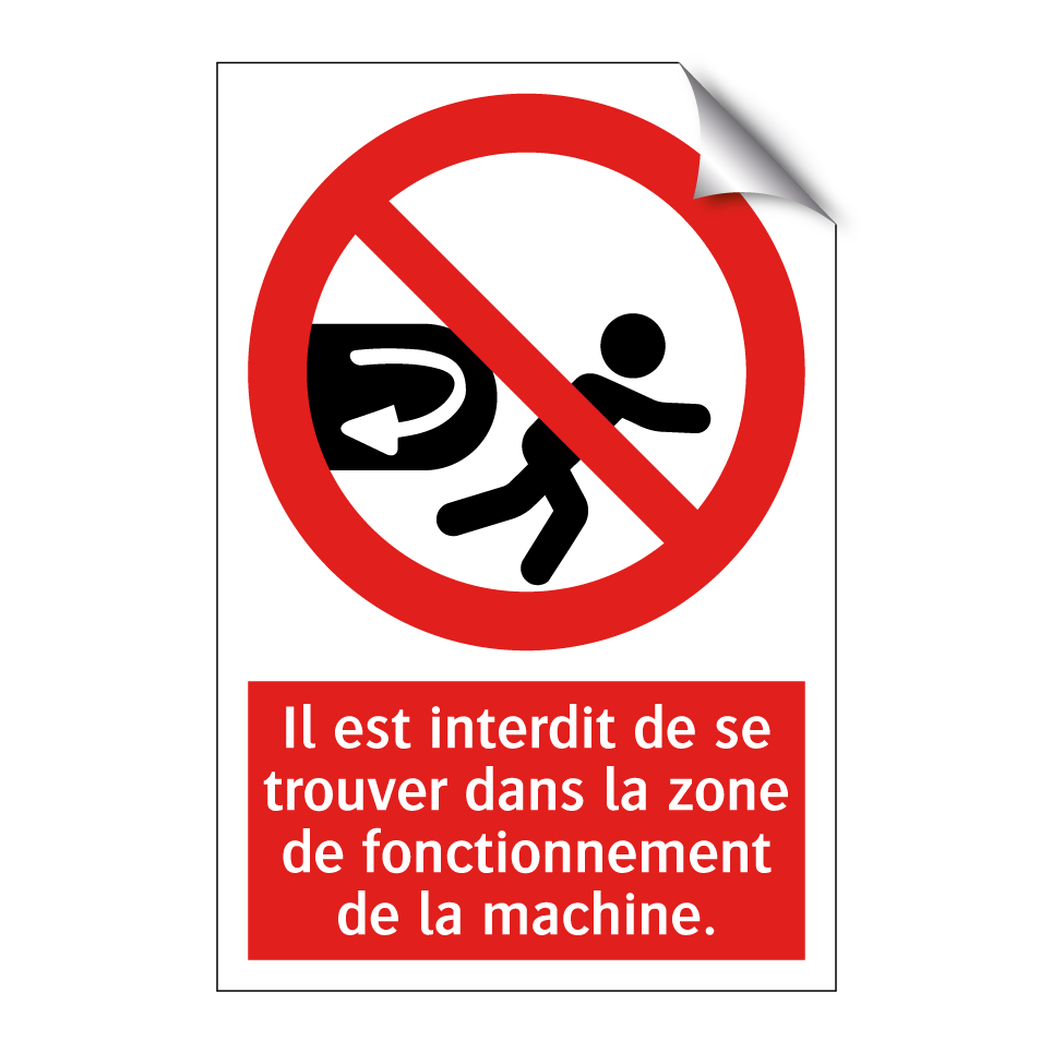 Panneau d'interdiction avec le texte : "Il est interdit de se trouver dans la zone de fonctionnement de la machine." et une symbolique claire.