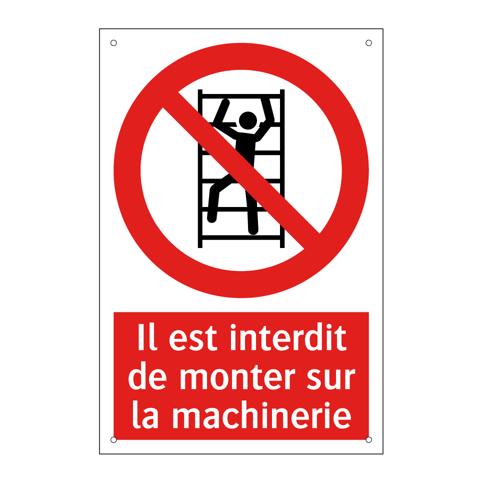 Panneau d'interdiction avec le texte : "Il est interdit de monter sur la machinerie" et une symbolique claire.