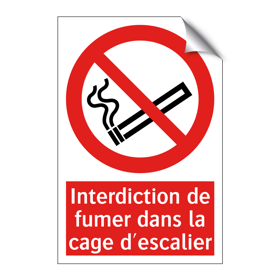 Panneau d'interdiction avec le texte : "Interdiction de fumer dans la cage d'escalier" et une symbolique claire.