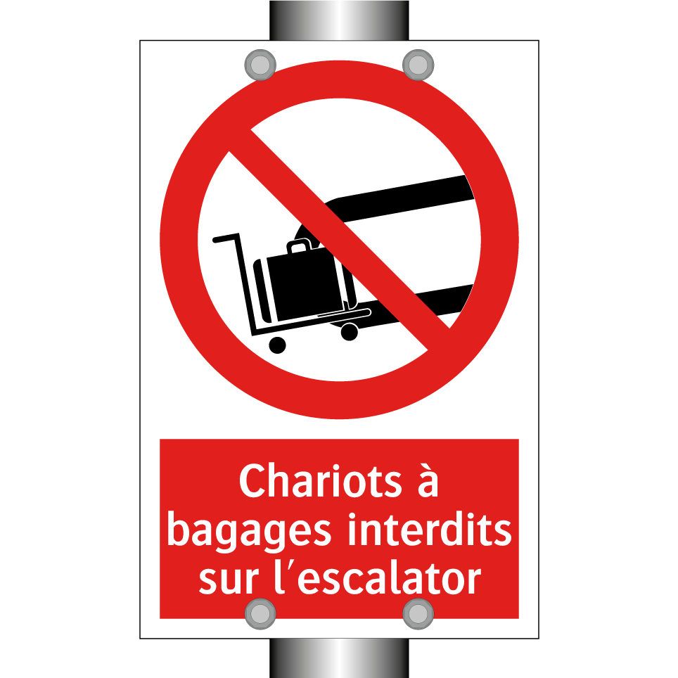Panneau d'interdiction avec le texte : "Chariots à bagages interdits sur l'escalator" et une symbolique claire.