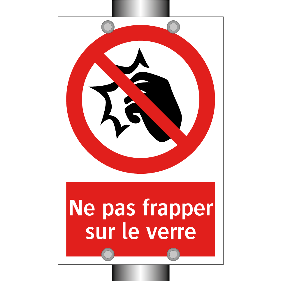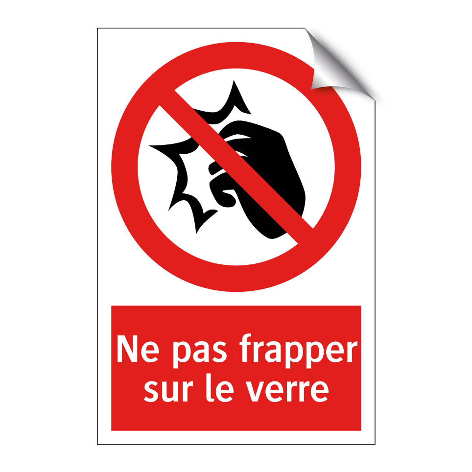 Panneau d'interdiction avec le texte : "Ne pas frapper sur le verre" et une symbolique claire.