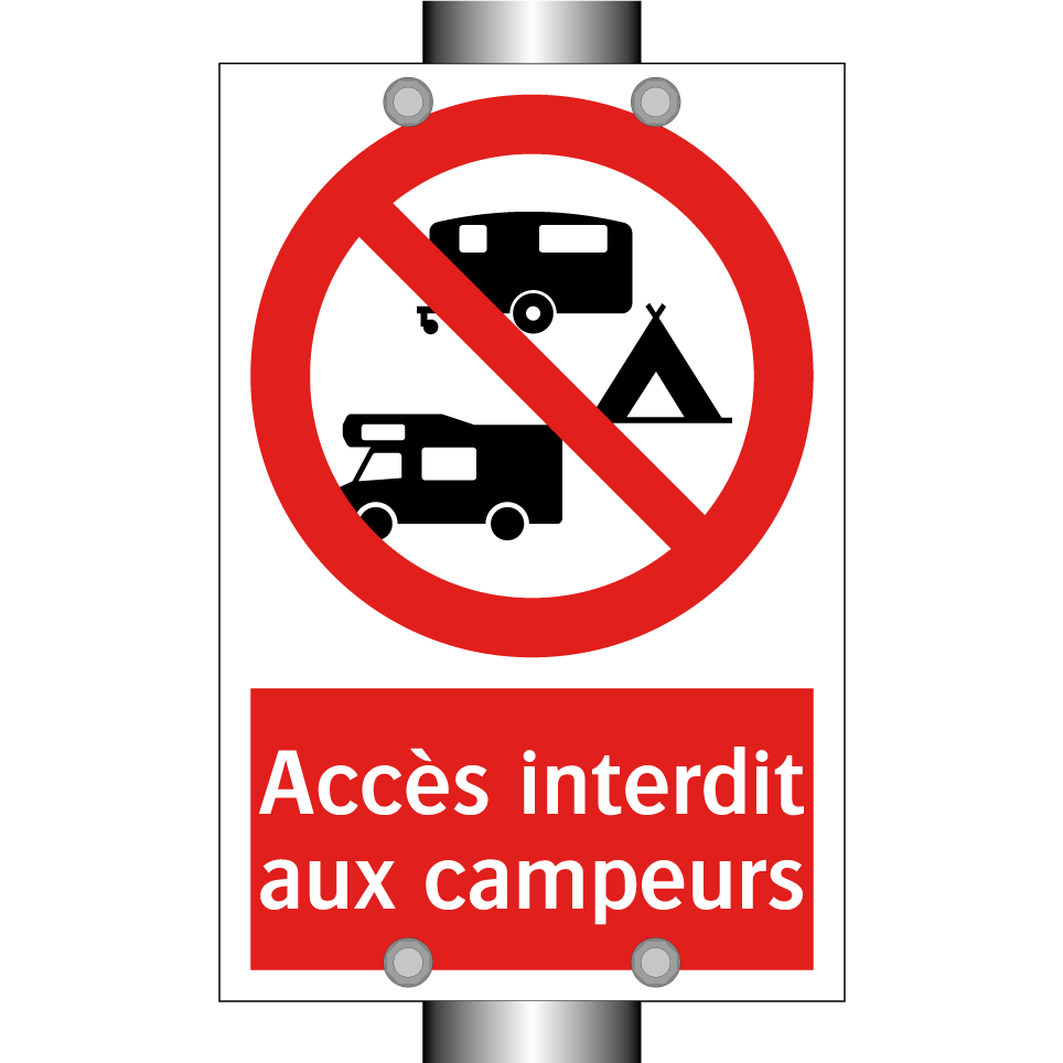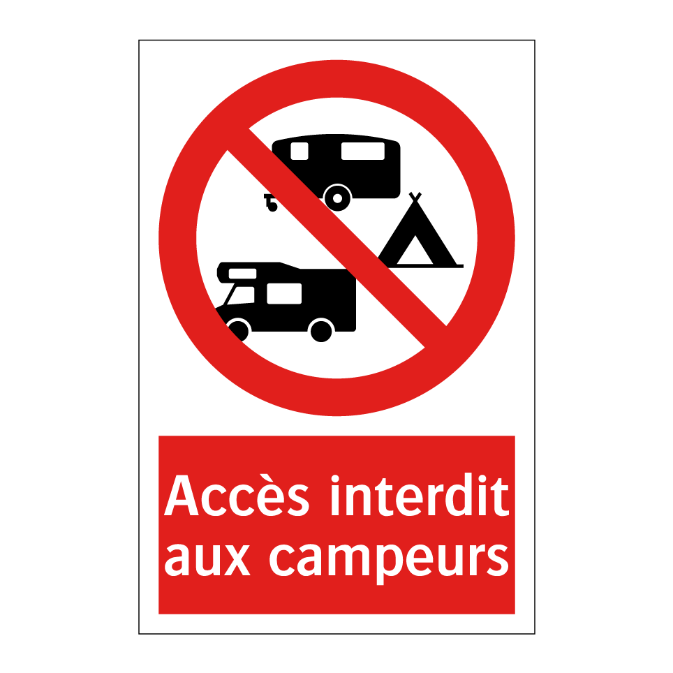 Panneau d'interdiction avec le texte : "Accès interdit aux campeurs" et une symbolique claire.