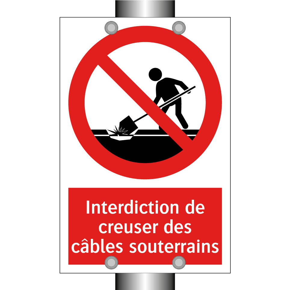 Panneau d'interdiction avec le texte : "Interdiction de creuser des câbles souterrains" et une symbolique claire.