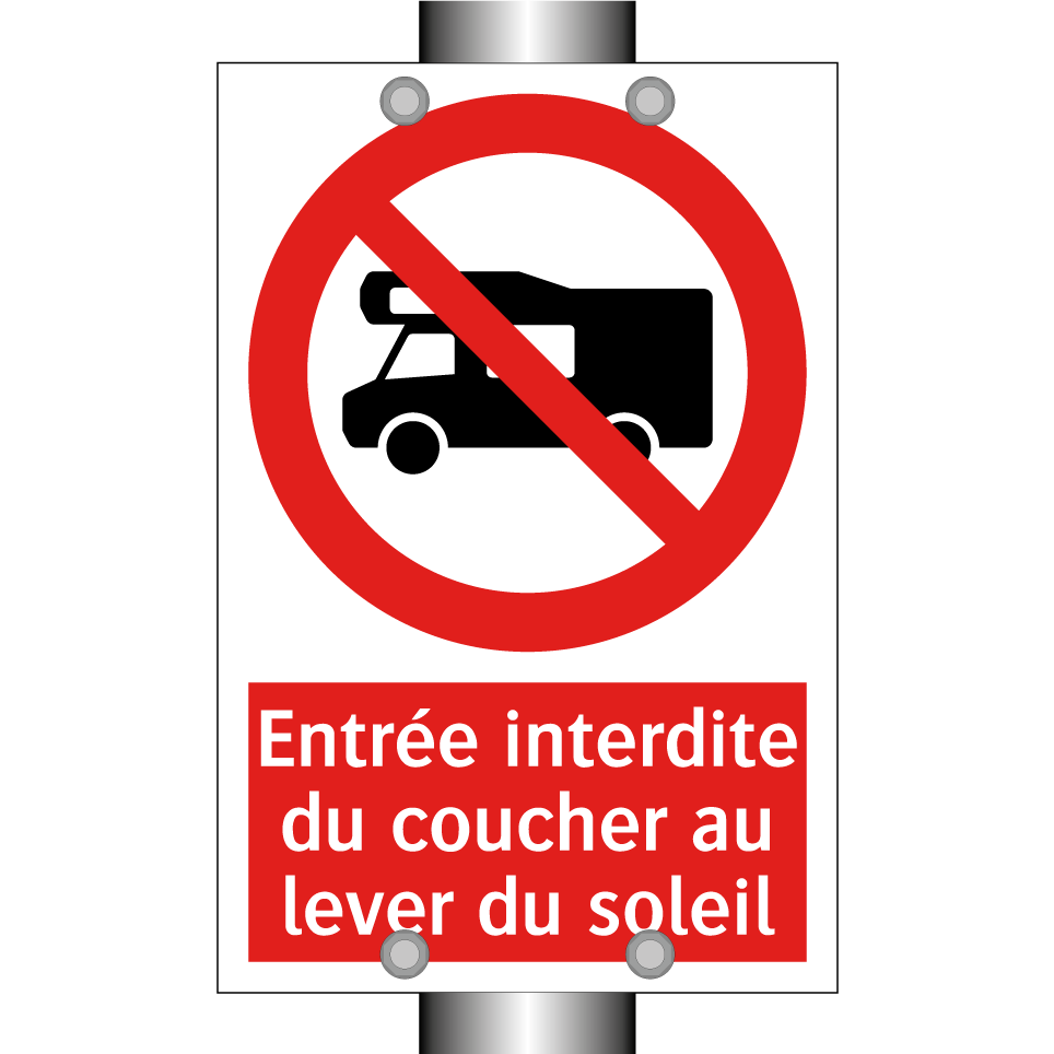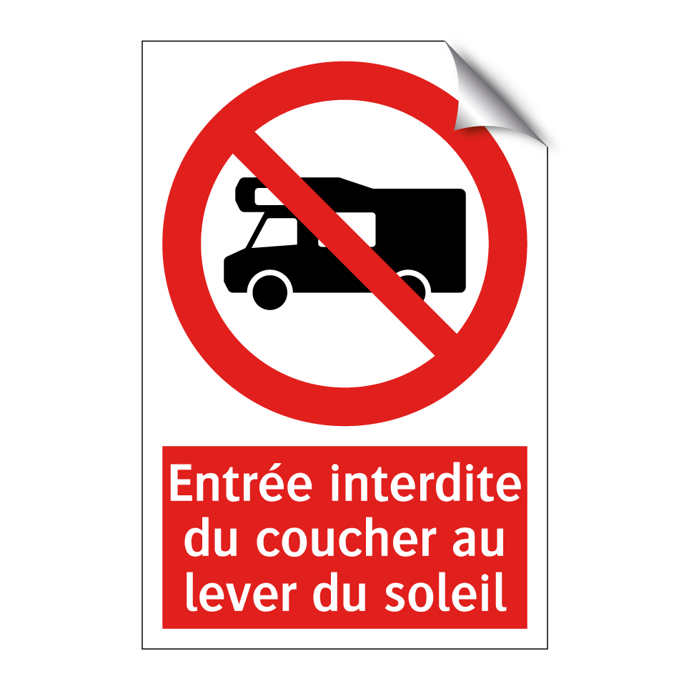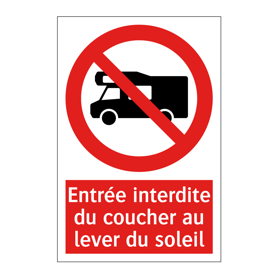 Panneau d'interdiction avec le texte : "Entrée interdite du coucher au lever du soleil" et une symbolique claire.