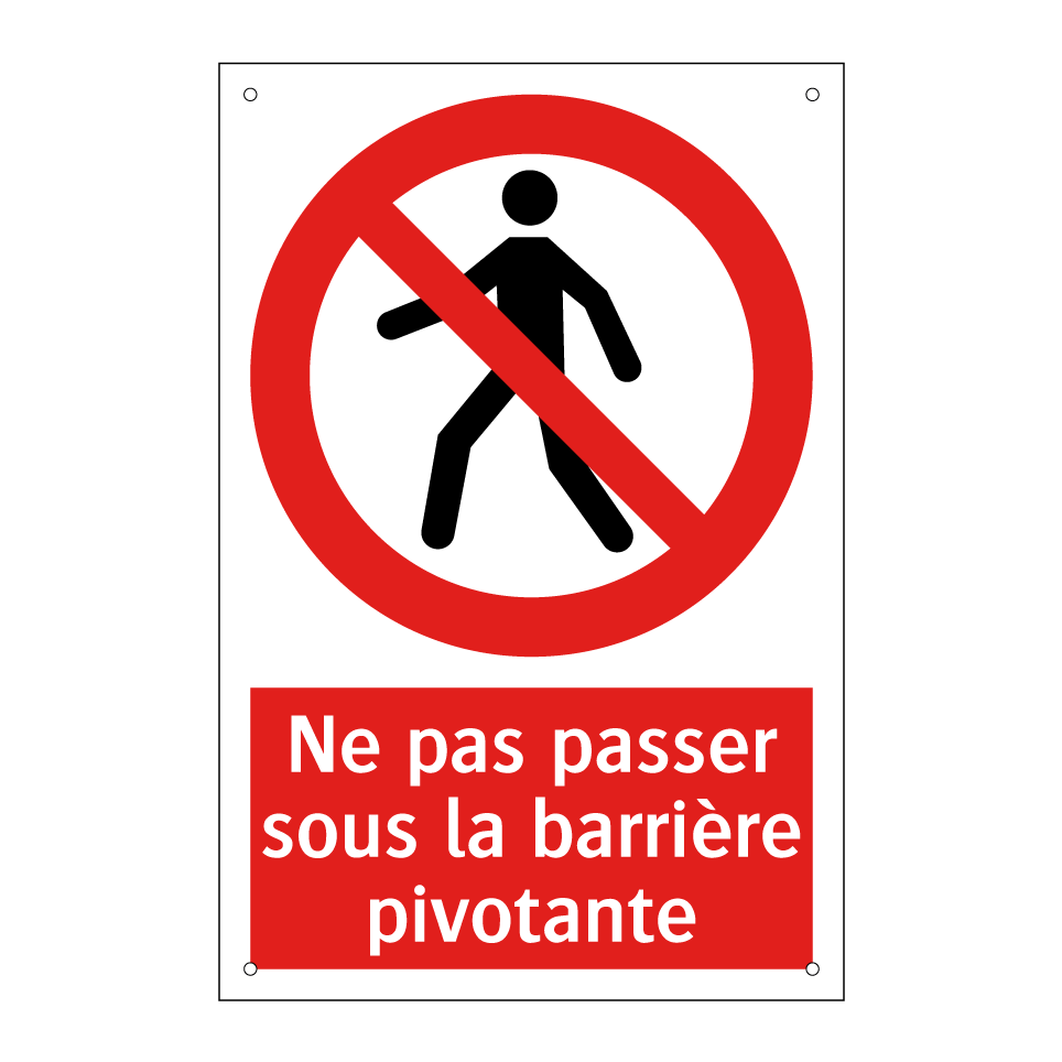 Panneau d'interdiction avec le texte : "Ne pas passer sous la barrière pivotante" et une symbolique claire.