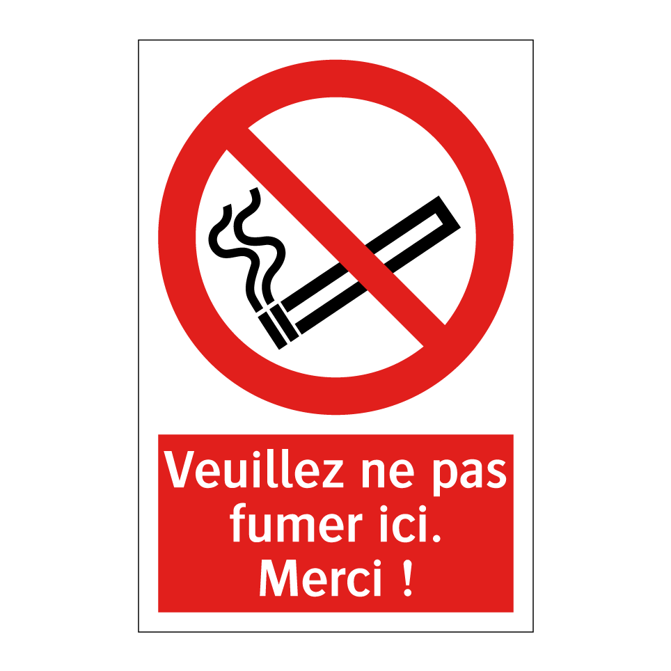 Panneau d'interdiction avec le texte : "Veuillez ne pas fumer ici. Merci !" et une symbolique claire.