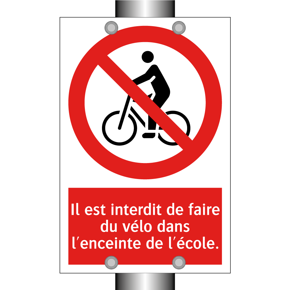 Panneau d'interdiction avec le texte : "Il est interdit de faire du vélo dans l'enceinte de l'école." et une symbolique claire.