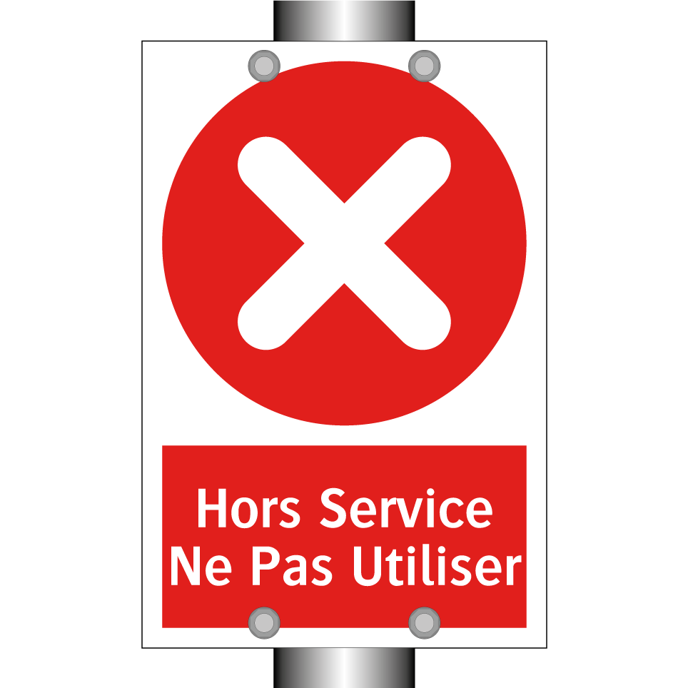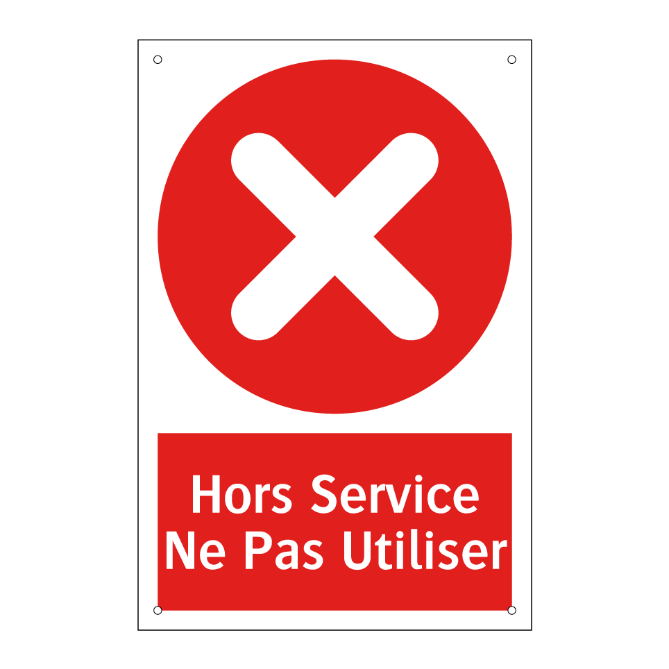 Panneau d'interdiction avec le texte : "Hors Service Ne Pas Utiliser" et une symbolique claire.