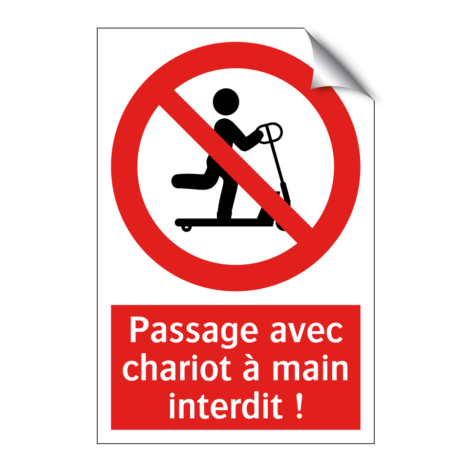 Panneau d'interdiction avec le texte : "Passage avec chariot à main interdit !" et une symbolique claire.
