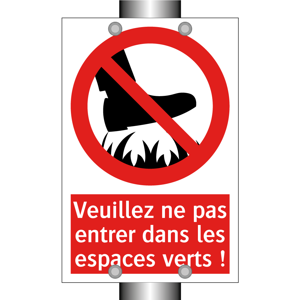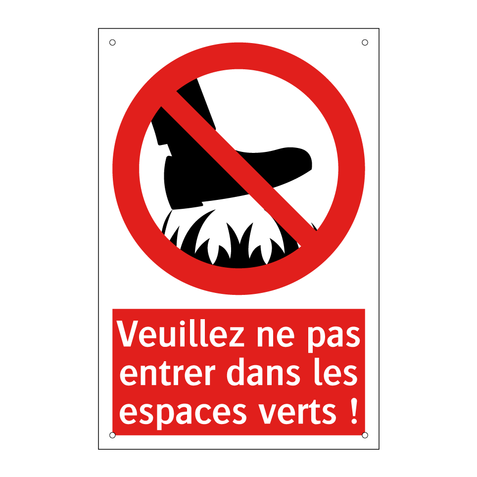 Panneau d'interdiction avec le texte : "Veuillez ne pas entrer dans les espaces verts !" et une symbolique claire.