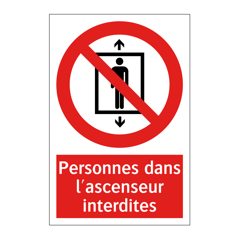 Panneau d'interdiction avec le texte : "Personnes dans l'ascenseur interdites" et une symbolique claire.