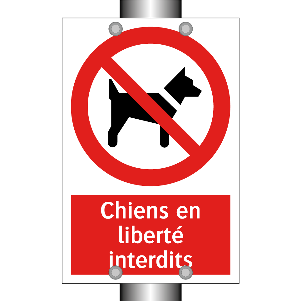 Panneau d'interdiction avec le texte : "Chiens en liberté interdits" et une symbolique claire.