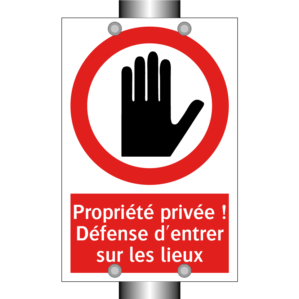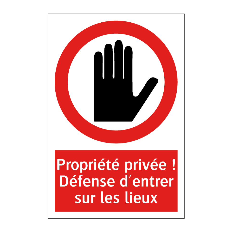 Panneau d'interdiction avec le texte : "Propriété privée ! Défense d'entrer sur les lieux" et une symbolique claire.