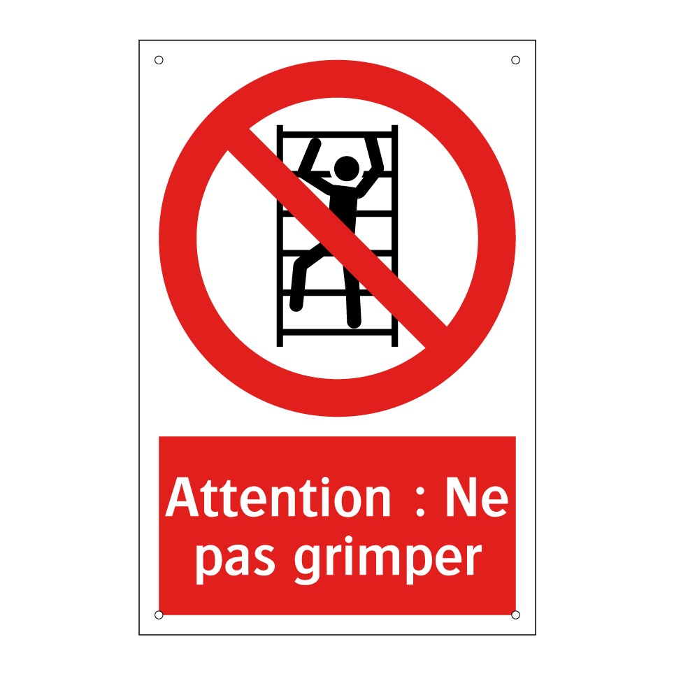 Panneau d'interdiction avec le texte : "Attention : Ne pas grimper" et une symbolique claire.