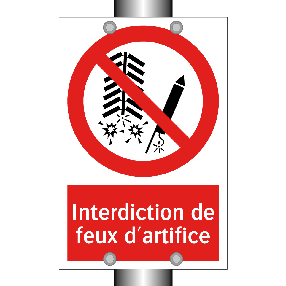 Panneau d'interdiction avec le texte : "Interdiction de feux d'artifice" et une symbolique claire.