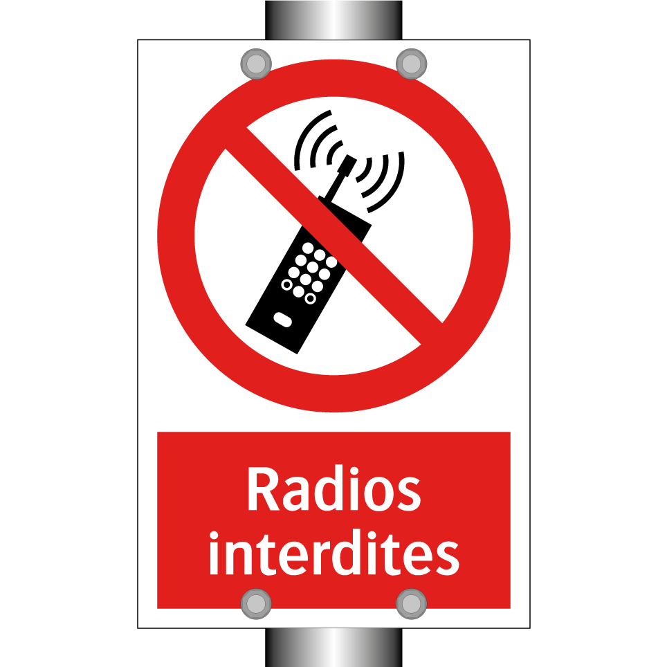 Panneau d'interdiction avec le texte : "Radios interdites" et une symbolique claire.