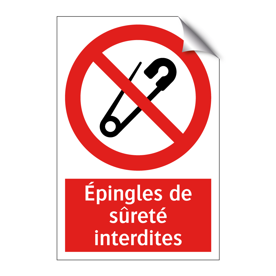 Panneau d'interdiction avec le texte : "Épingles de sûreté interdites" et une symbolique claire.