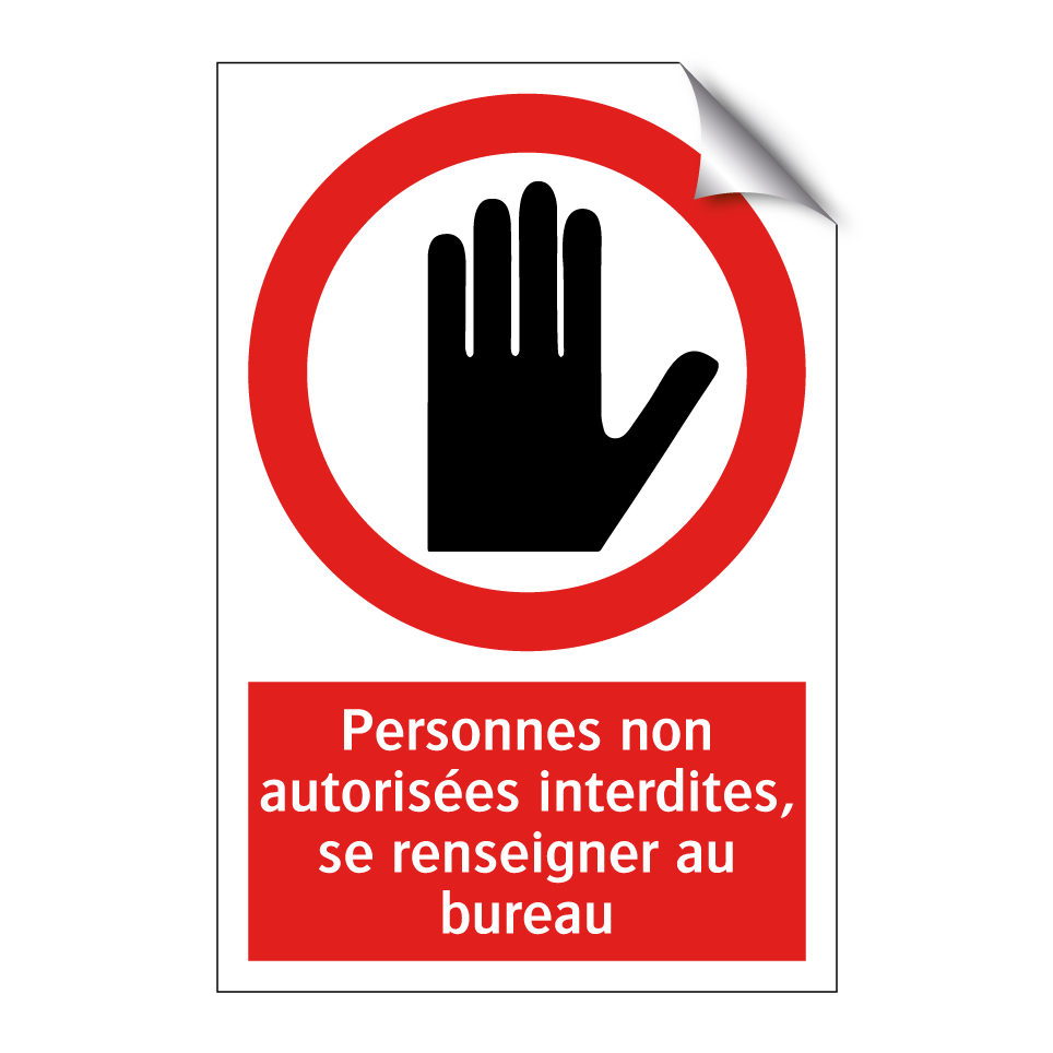 Panneau d'interdiction avec le texte : "Personnes non autorisées interdites, se renseigner au bureau" et une symbolique claire.