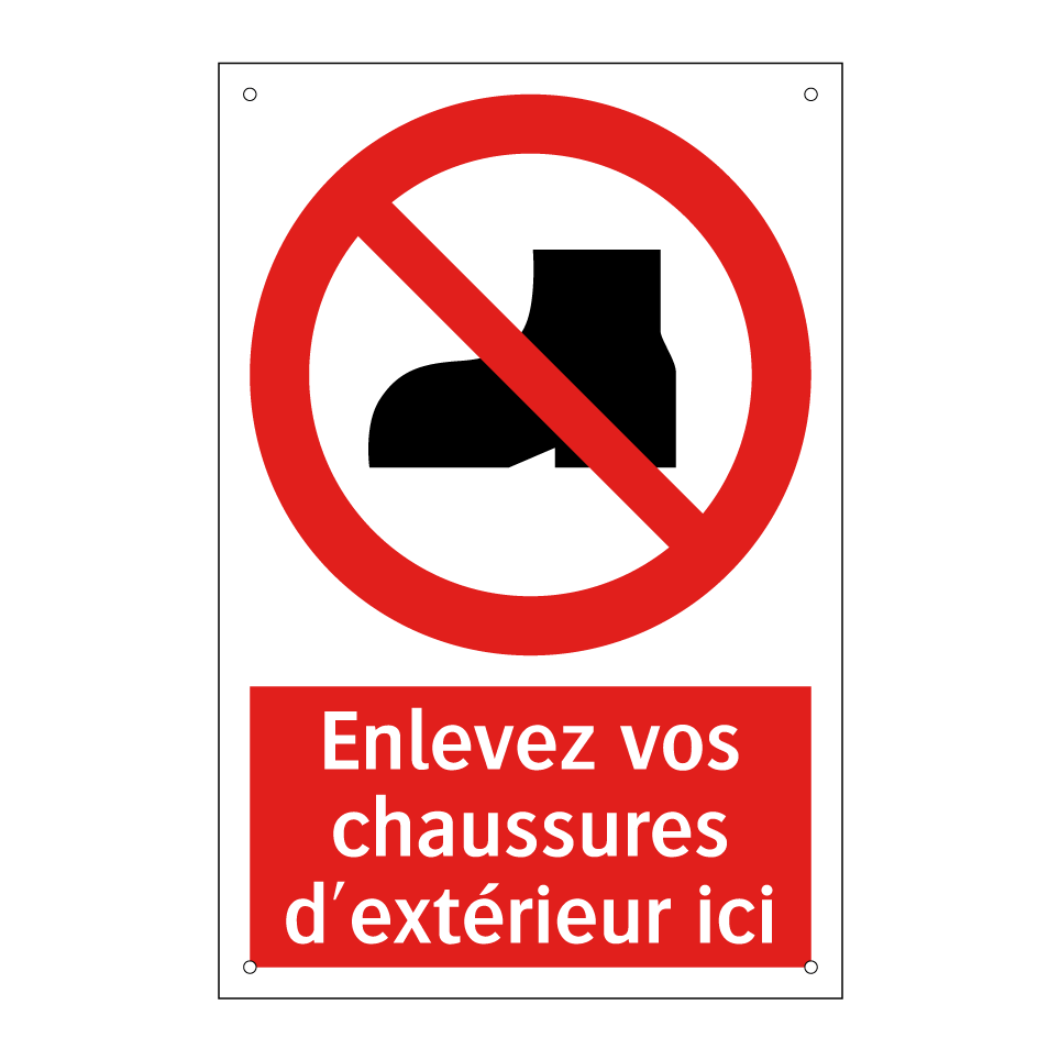 Panneau d'interdiction avec le texte : "Enlevez vos chaussures d'extérieur ici" et une symbolique claire.
