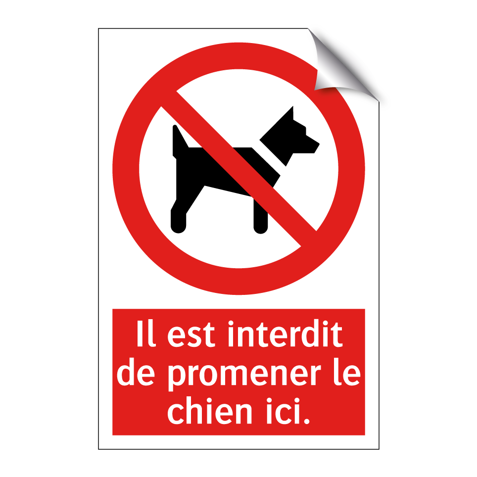 Panneau d'interdiction avec le texte : "Il est interdit de promener le chien ici." et une symbolique claire.