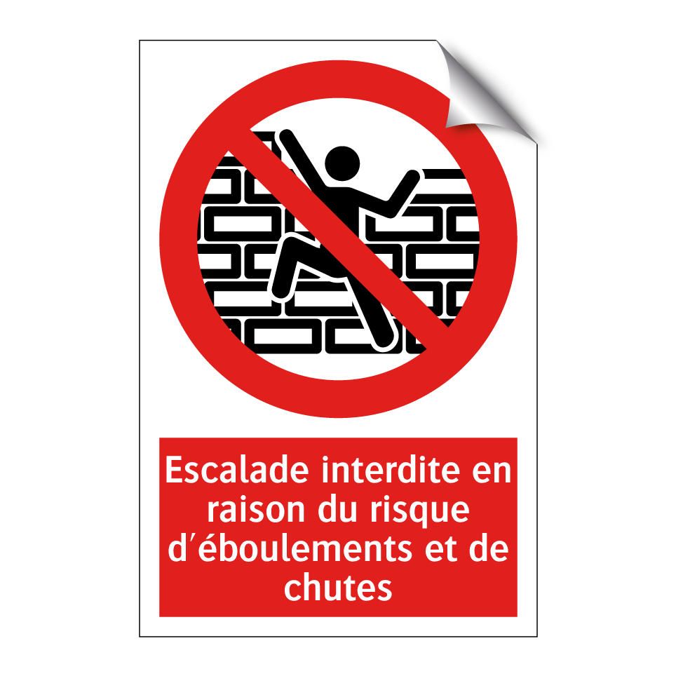 Panneau d'interdiction avec le texte : "Escalade interdite en raison du risque d'éboulements et de chutes" et une symbolique claire.