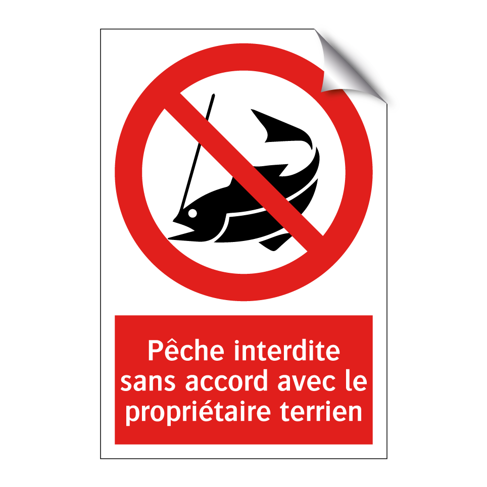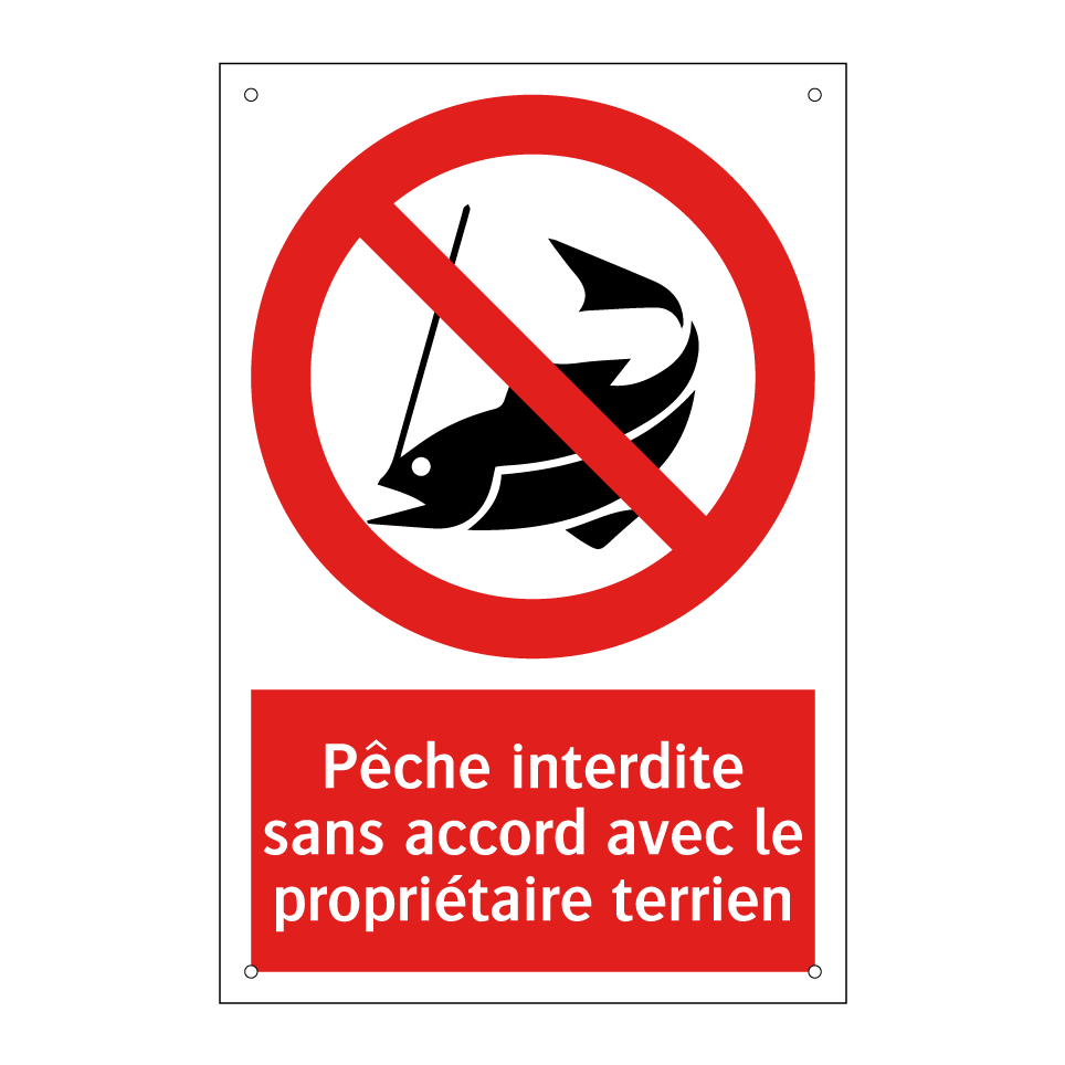 Panneau d'interdiction avec le texte : "Pêche interdite sans accord avec le propriétaire terrien" et une symbolique claire.
